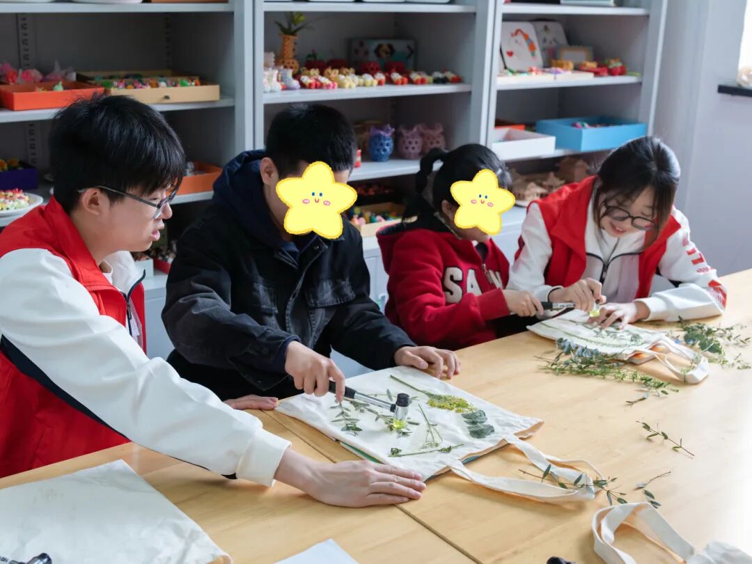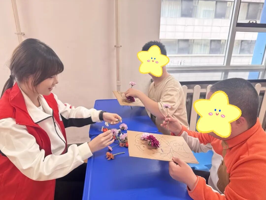 春日的树叶与花瓣成为天然画笔,在志愿者的陪伴下,孩子们将植物的自然纹理轻轻拓印在上面。一幅幅色彩灵动的作品跃然于上,大家在专注的创作中感受自然与艺术的双重魅力,用独一无二的作品诉说内心的细腻世界。